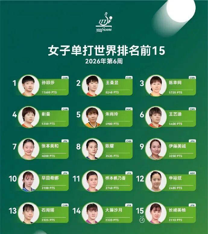 2026年第6周,世界乒联(WTT)最新公布的世界排名显示,国乒依旧是男子女子单打赛场上无可争议的统治者。男子方面,王楚钦和林诗栋稳定占据前两名,展现了强大的竞争力和领先优势;女子方面,孙颖莎、王曼昱、陈幸同和蒯曼牢牢占据前四席,紧接着是王艺迪位列第六、陈熠第八,整体阵容深厚。这份榜单充分体现出国乒梯队建设的成果与整体实力的坚实基础。